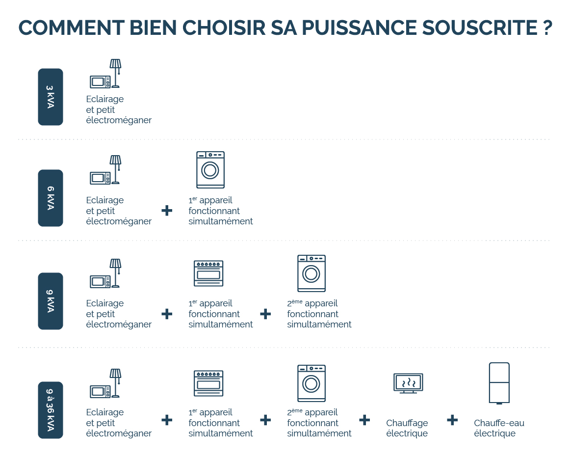 Il est donc important de prendre en compte le nombre d’appareils électriques, leur puissance de fonctionnement ainsi que la manière dont vous les utilisez (simultanément ou non).